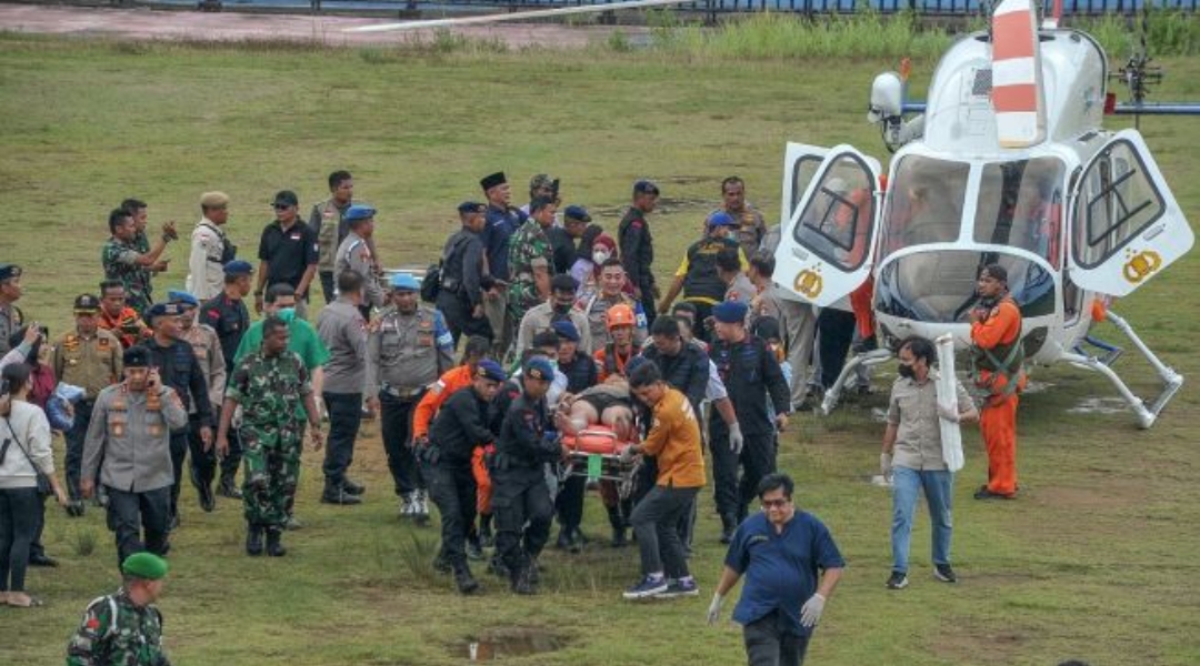 Helikopter tim evakuasi yang tiba langsung di sambut tim medis beserta pasukan gabungan.
