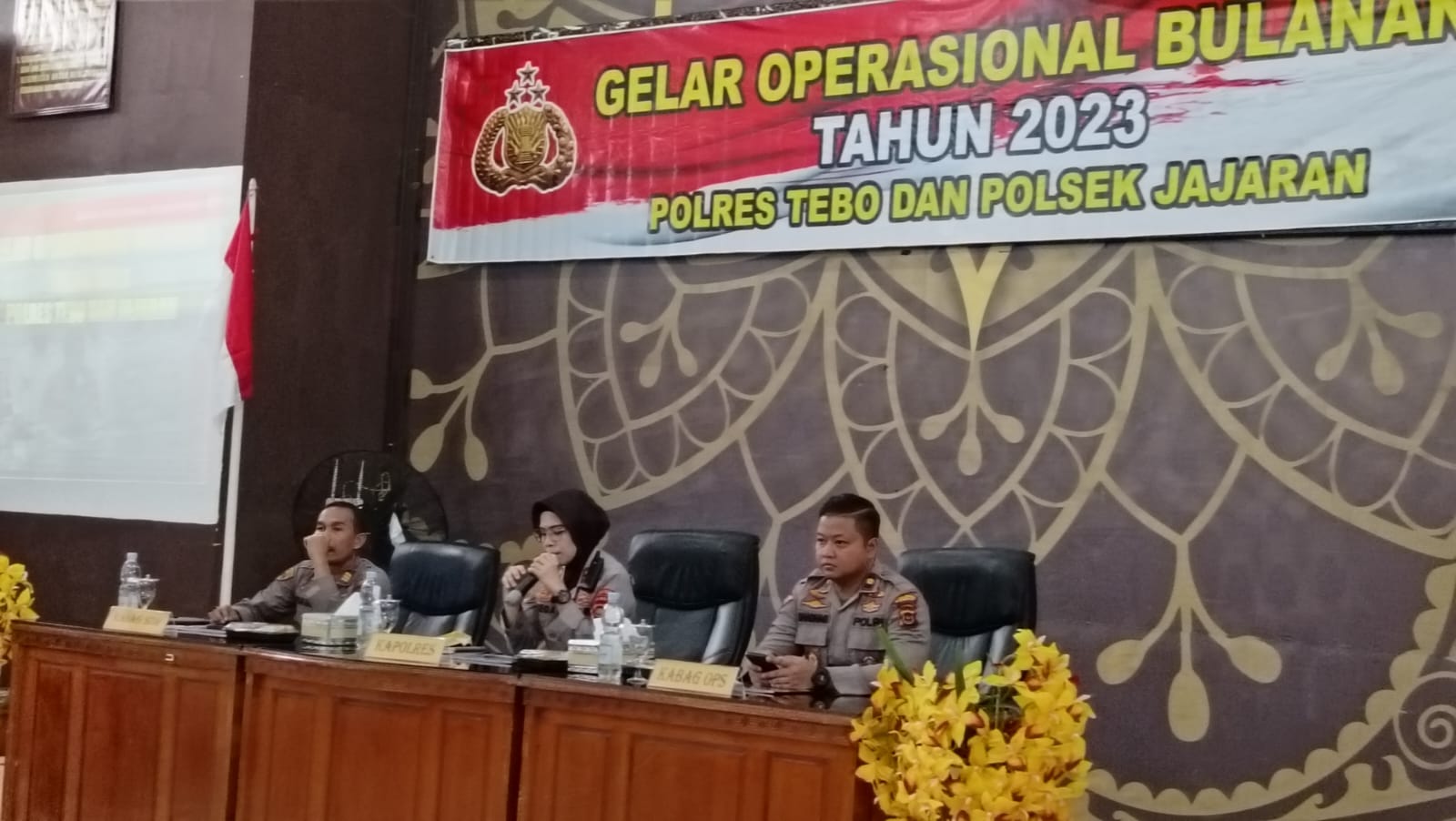 TEBO – Polres Tebo melaksanakan rapat Gelar Operasional (GO) Bulanan Polres Tebo dan Polsek Jajaran Tahun 2023 yang dipimpin langsung Kapolres Tebo AKBP Fitria Mega, M.Psi., P.Si. dan didampingi oleh Kabag Ops Polres Tebo Kompol Dhadhag A.SH.S.ik .MH dan Kabag SDM Polres Tebo AKP Pujiarso, SH. bertempat di Ruangan Aula Wira Astha Brata Polres Tebo, Selasa ( 30/05/2023 ).