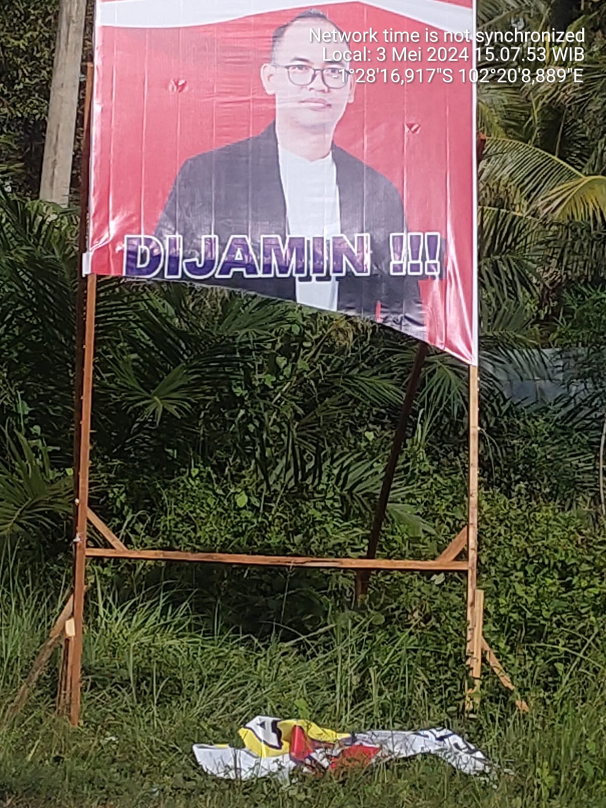 Hari ini jumat 03/05 /24 terlihat berapa baleho yang di pasang di robek orang tidak bertanggung jawab seperti di Desa Sungai Alai Kabupaten Tebo – Jambi,