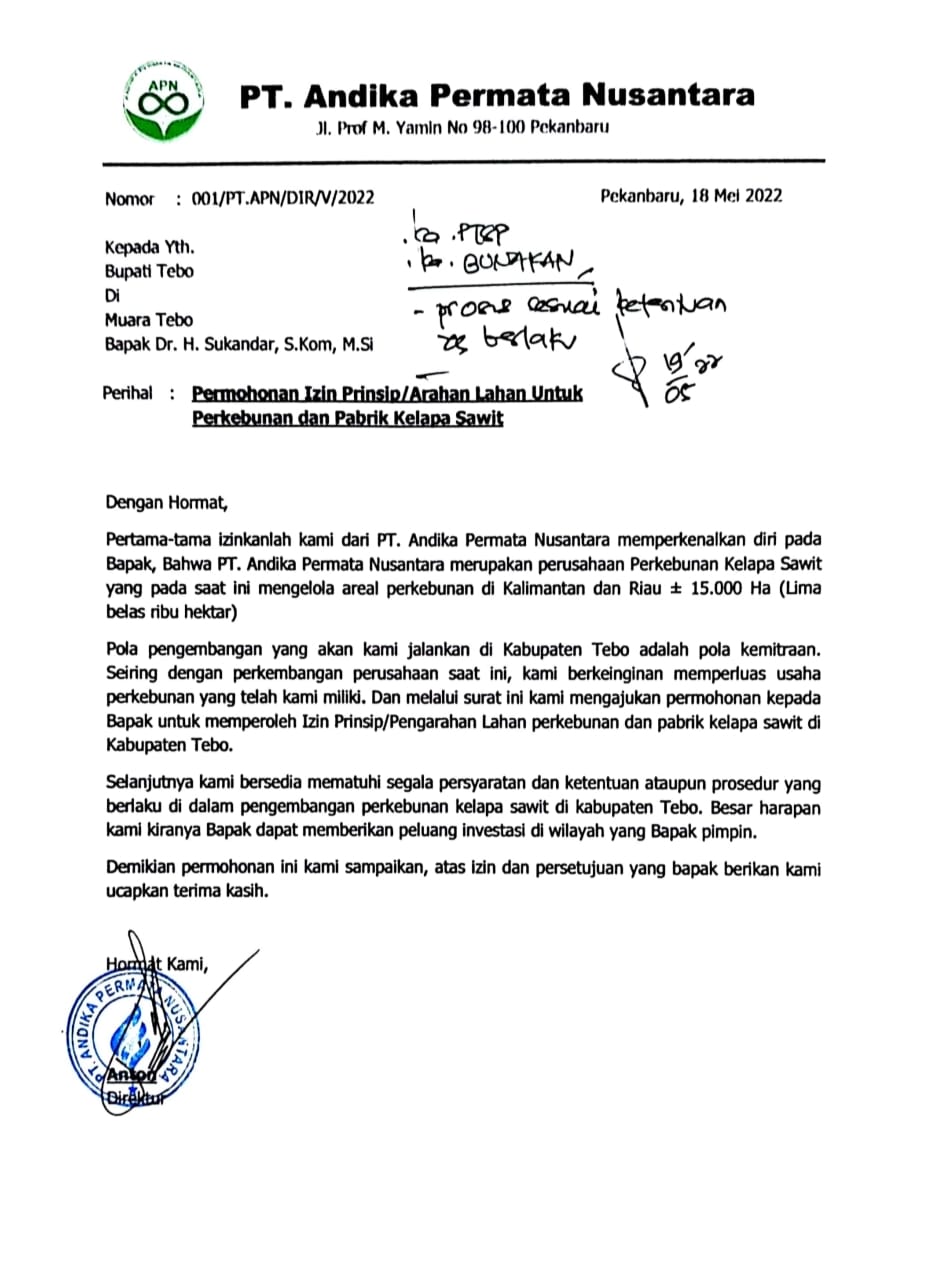 – Berdasarkan Foto Copy surat nomor : 001/PT.APN/DIR/V/2022 perihal Permohonan Izin Prinsip/Arahan Lahan untuk Perkebunan dan Pabrik Kelapa Sawit tanggal 18 Mei 2022 dari PT. Andika Permata Nusantara kepada HS selaku Bupati Tebo yang kami dapatkan bahwa tertulis disposisi diduga dari Saudara HS selaku Bupati Tebo yang bertuliskan “Ka.PTSP, Ka.Bunakan. proses sesuai ketentuan yg belaku” tertanggal 19 Mei 2022 (Data terlampir)