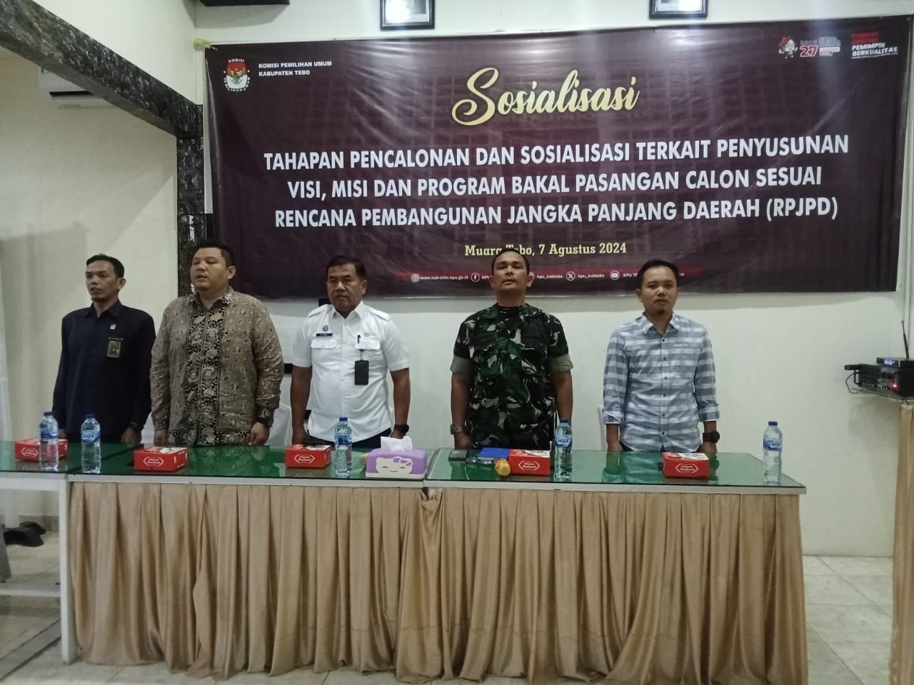 TEBO, Infonegerijambi.com – Dalam rangka mensukseskan pemilu, komisi pemilihan umum daerah (KPUD) Tebo Lakukan Sosialisasi Tahapan Pencalonan dan sosialisasi terkait penyusunan visi, misi dan program bakal pasangan calon sesuai rencana pembangunan jangka panjang daerah (RPJPD) acara di laksanakan di aula GN Hotel Tebo, yang beralamat di Km 1 Tebo – Jambi 07/08/2024 pagi.
