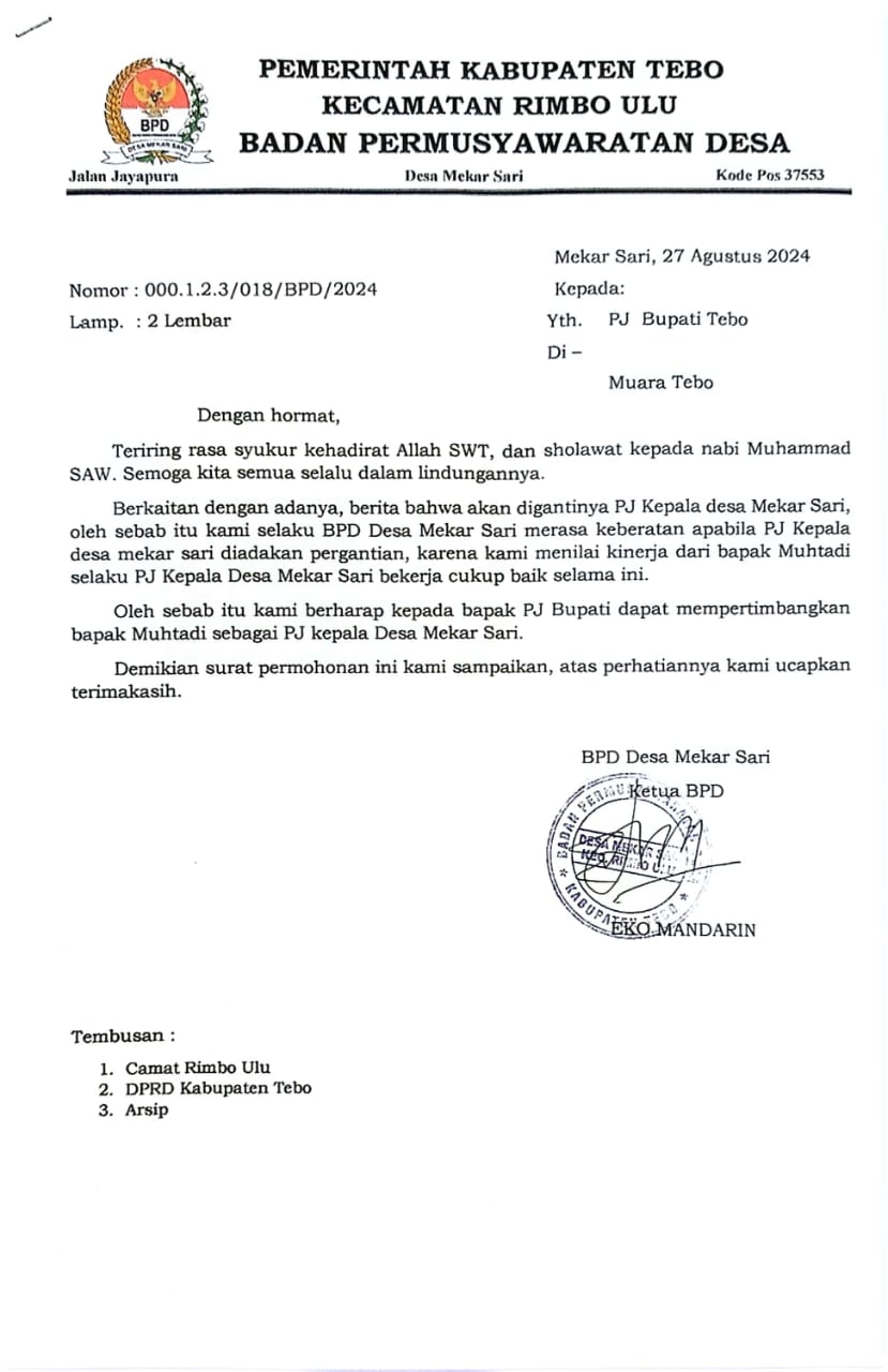 Dikatakannya, surat itu merupakan bentuk formal dari permohonan BPD Desa Mekar Sari kepada Pj Bupati Tebo untuk mempertahankan Pj Kepala Desa yang saat ini menjabat.