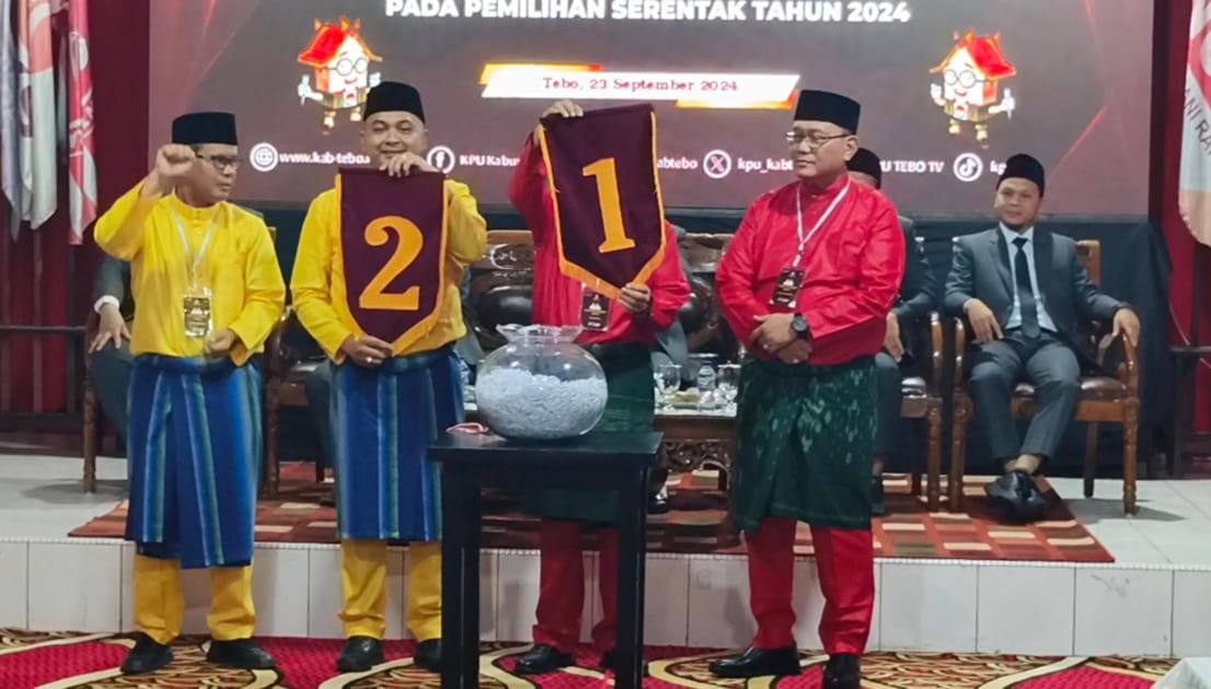 Pantauan dilapangan, pencabutan nomor urut ini disaksikan langsung oleh Badan Pengawas Pemilu (Bawaslu) Kabupaten Tebo, dan dihadiri segenap undangan, serta tim pemenangan pasangan calon.