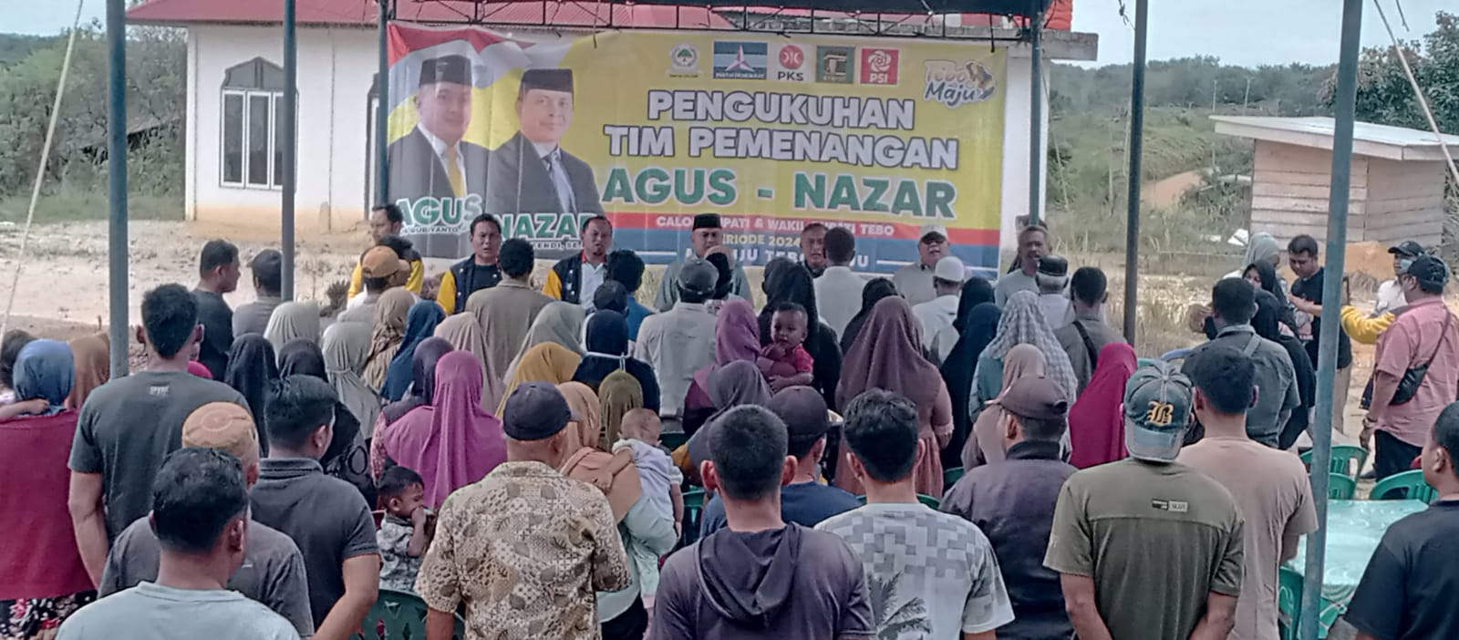 TEBO, INFONEGERIJAMBI.COM – Warga Dusun Kelumpang dan Sentano Desa Balai Rajo Kecamatan VII Koto Ilir, sepakat menangkan pasangan calon Bupati dan wakil bupati Kabupaten Tebo, Agus Rubiyanto dan Nazar Efendi pada Pilkada 2024.