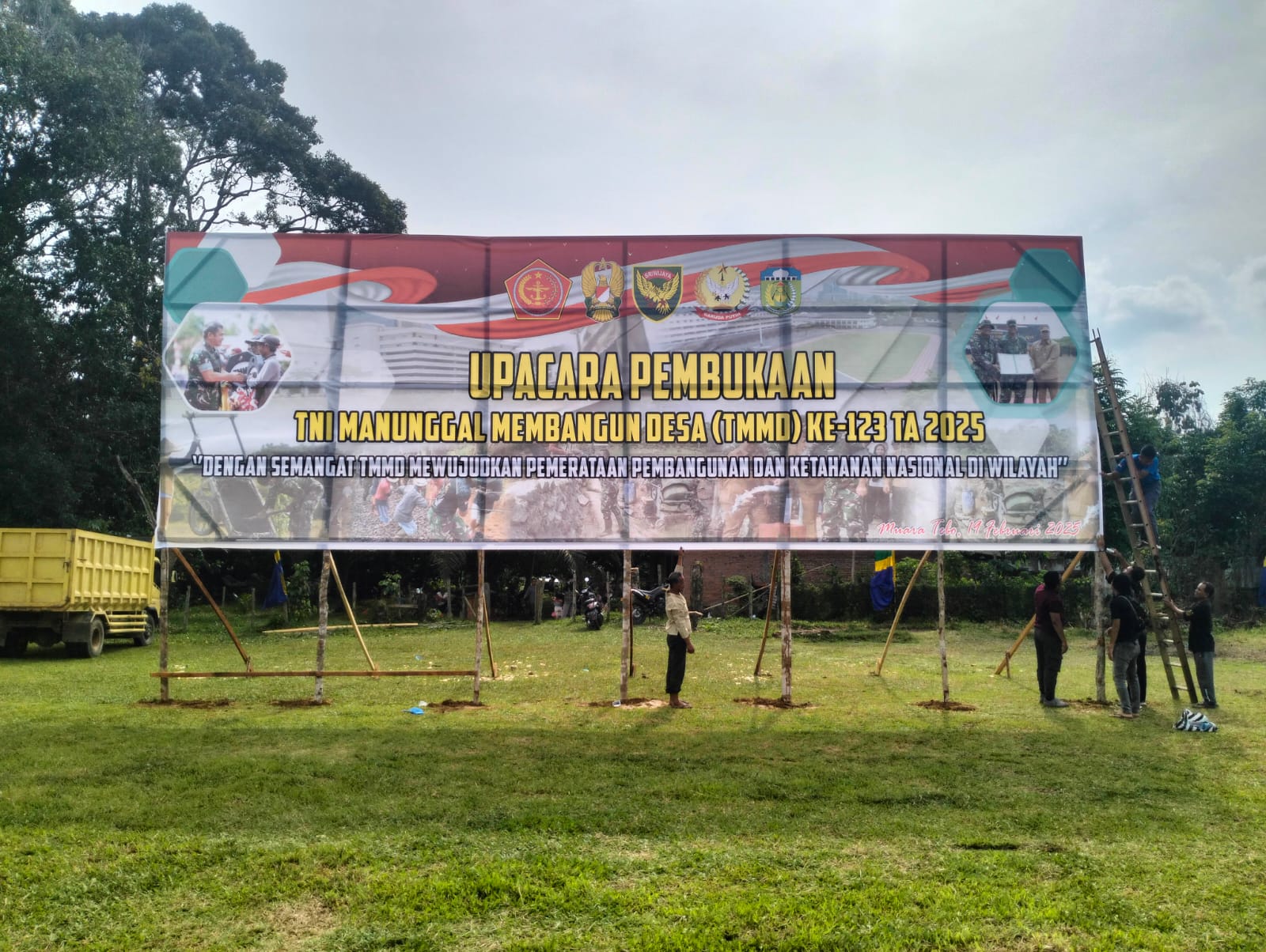 TEBO – Banner raksasa Tentara Nasional Indonesia (TNI) Manunggal Membangun Desa (TMMD) ke-123 Kodim 0416/Bute telah terbentang di lapangan sepak bola Desa Teluk Kuali, Kecamatan Tebo Ulu, Kabupaten Tebo. Pemasangan banner ini menandakan kesiapan pelaksanaan upacara pembukaan yang dijadwalkan pada Rabu, 19 Februari 2025.