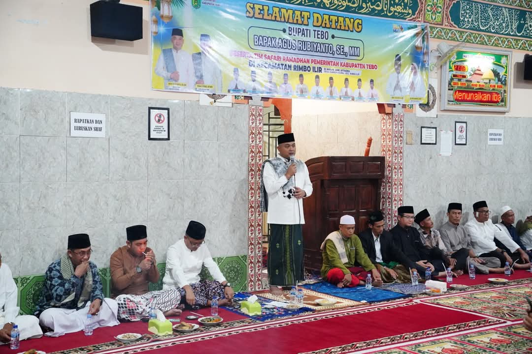 TEBO – Bupati Tebo, Agus Rubiyanto, SE.MM, beserta rombongan melaksanakan Safari Ramadan 1446 H di Masjid Jami Attaqwa, Desa Sumber Agung, Kecamatan Rimbo Ilir, pada Rabu, 12 Maret 2025. Kegiatan ini merupakan bagian dari upaya pemerintah daerah dalam mempererat hubungan dengan masyarakat sekaligus berbagi berkah di bulan suci Ramadan.