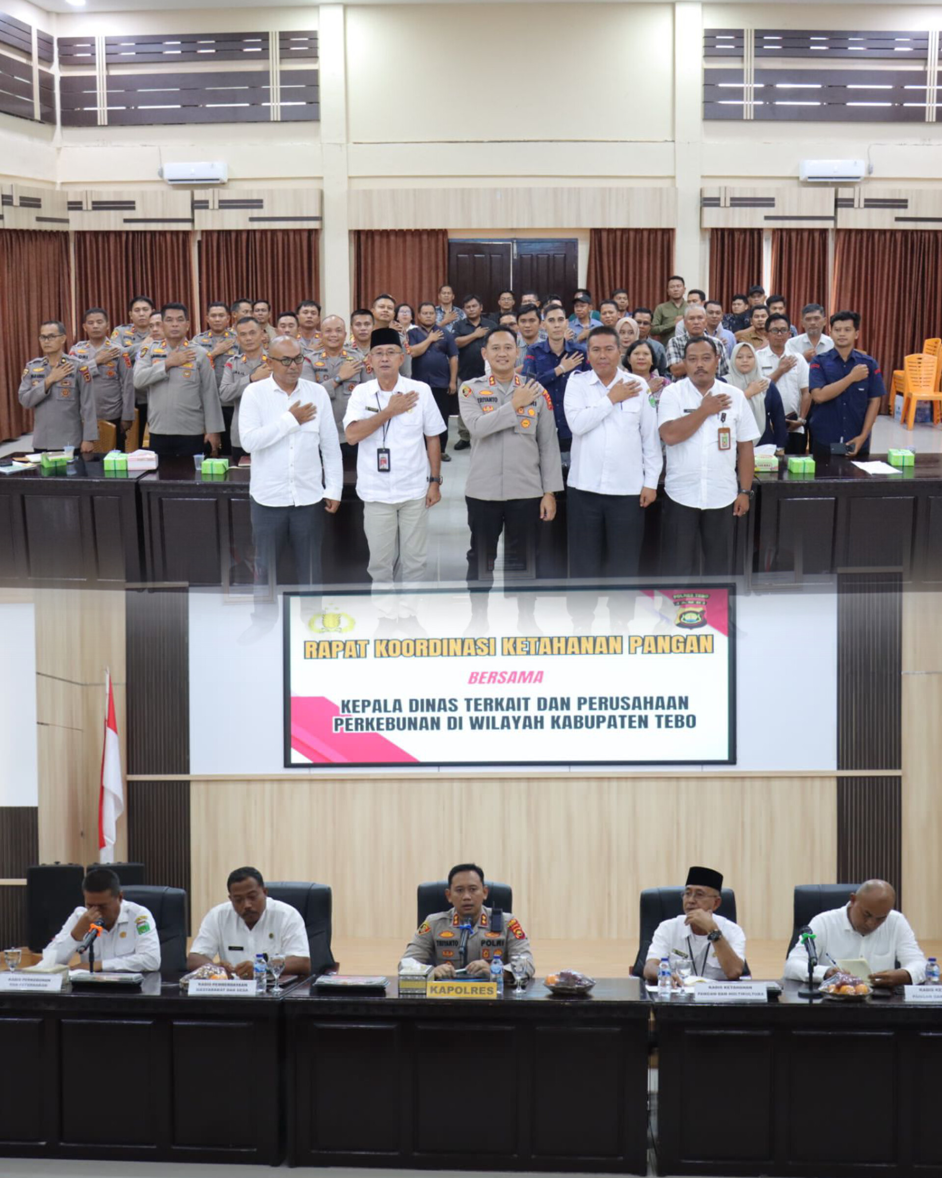 POLRES TEBO – Dalam rangka mendukung program nasional ketahanan pangan yang dicanangkan oleh Presiden RI, Polres Tebo menggelar rapat koordinasi bersama kepala dinas terkait dan sejumlah perusahaan perkebunan yang beroperasi di wilayah Kabupaten Tebo. Kegiatan ini berlangsung di Aula Bhayangkara Polres Tebo pada Rabu (28/5) pukul 10.00 WIB dan berakhir pukul 12.00 WIB dalam suasana tertib dan kondusif.