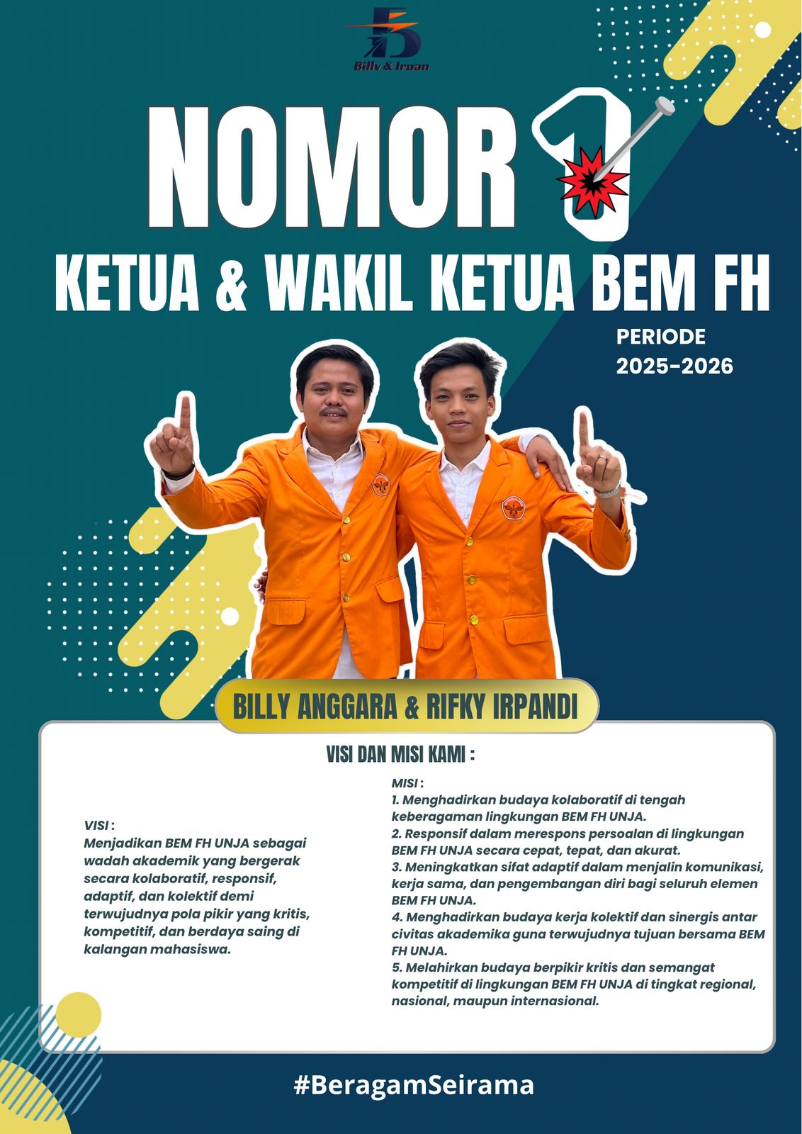 Dengan semangat “Beragam Seirama”, kita membawa visi kepemimpinan yang inklusif, partisipatif, dan progresif. Kepemimpinan yang tidak memaksakan keseragaman, tapi merayakan keberagaman dalam satu tujuan: menjadikan BEM sebagai wadah yang adil, aktif, dan nyata bekerja untuk kepentingan bersama.