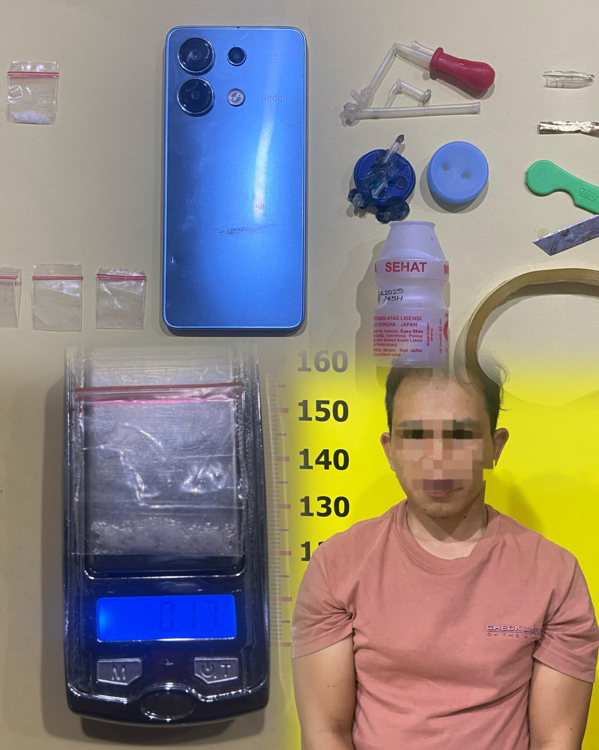 Adapun barang bukti yang disita antara lain satu plastik klip sedang berisi sabu seberat 0,17 gram bruto, tiga plastik klip kosong, satu unit handphone, satu set alat hisap (bong), serta pisau kecil dan lakban yang diduga digunakan dalam aktivitas penyalahgunaan narkoba.