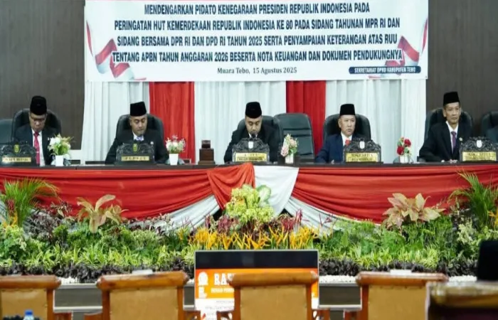 TEBO – DPRD Kabupaten Tebo menggelar rapat paripurna istimewa dalam rangka memperingati Hari Kemerdekaan Republik Indonesia ke-80, Jumat (15/8/2025). Agenda ini dilaksanakan untuk menyaksikan siaran langsung sidang tahunan MPR RI dan sidang bersama DPR RI dan DPD RI, sekaligus mendengarkan penyampaian keterangan atas RUU APBN Tahun Anggaran 2026 beserta nota keuangan dan dokumen pendukungnya.