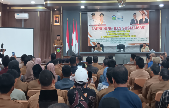 TEBO – Pemerintah Kabupaten Tebo secara resmi meluncurkan dua program strategis, yakni Semangka Tebo (Strategi Peningkatan Jaminan Sosial Ketenagakerjaan bagi Tenaga Kerja Rentan) dan Lentera Desa (Pemberdayaan Suku Anak Dalam), Selasa (12/8/2025). Peluncuran tersebut dilaksanakan bersamaan dengan Rapat Koordinasi dan Sosialisasi Kegiatan Koperasi Desa Merah Putih di Pendopo Rumah Dinas Bupati Tebo.