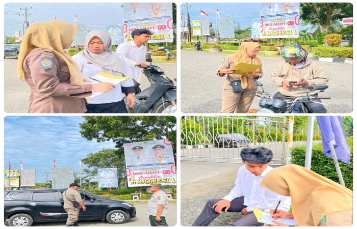 Petugas dari Satpol PP dan BKPSDM Kabupaten Tebo saat melakukan penertiban terhadap ASN dan PPPK yang berada di luar kantor saat jam dinas, Rabu (6/8/2025). Dalam kegiatan ini, petugas melakukan pendataan dan meminta keterangan langsung dari pegawai yang terjaring di area sekitar Komplek Perkantoran KM 12.(INJ/Ist)