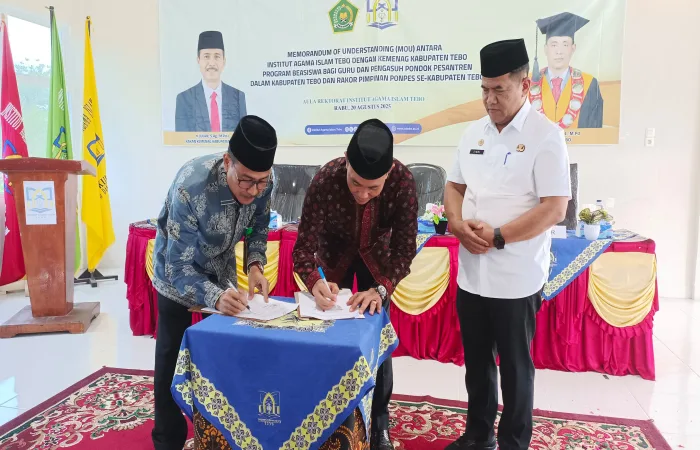 TEBO – Institut Agama Islam (IAI) Tebo bersama Kementerian Agama (Kemenag) Kabupaten Tebo resmi menandatangani Memorandum of Understanding (MoU) terkait program beasiswa bagi guru dan pengasuh pondok pesantren. Kegiatan berlangsung di Aula Utama IAI Tebo, Rabu (20/8/2025), dan dihadiri oleh Plt. Sekda Tebo Dr. Sindi, Rektor IAI Tebo Dr. Nurhuda, serta Kepala Kemenag Kabupaten Tebo H. Julan, S.Ag., M.Pd.I.