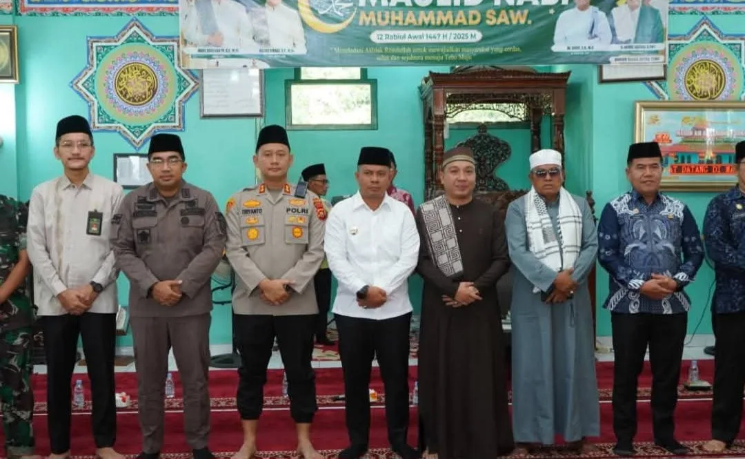 TEBO – Suasana khidmat mewarnai peringatan Maulid Nabi Muhammad SAW 1447 H yang digelar di Masjid YAMP KH Zahrudin Usman, Km 12, Kamis (4/9/2025). Wakil Bupati Tebo, H. Nazar Efendi, SE., M.Si., hadir sekaligus membuka secara resmi kegiatan tersebut yang diikuti oleh jajaran pemerintah daerah, tokoh agama, tokoh masyarakat, hingga ratusan jamaah dari berbagai penjuru.