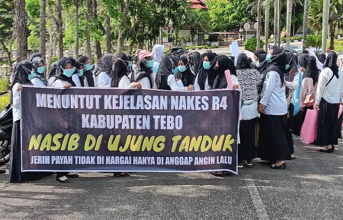 TEBO – Ratusan tenaga honorer kategori R4 di Kabupaten Tebo menggelar aksi damai di halaman Kantor Bupati dan BKPSDM Tebo, Senin (15/9/2025). Sejak pukul 09.00 WIB, massa sudah memadati gerbang kantor bupati sambil membawa spanduk bertuliskan tuntutan agar pemerintah segera memberikan kejelasan status kepegawaian mereka.