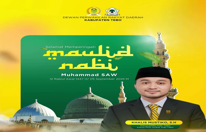 TEBO – Ketua DPRD Kabupaten Tebo, Khalis Mustiko, S.H., mengucapkan selamat memperingati Maulid Nabi Muhammad SAW 1447 H / 2025 M kepada seluruh umat muslim, khususnya masyarakat Kabupaten Tebo. Ucapan ini disampaikannya sebagai bentuk rasa syukur dan ajakan untuk memperkuat keimanan serta kecintaan kepada Rasulullah SAW.