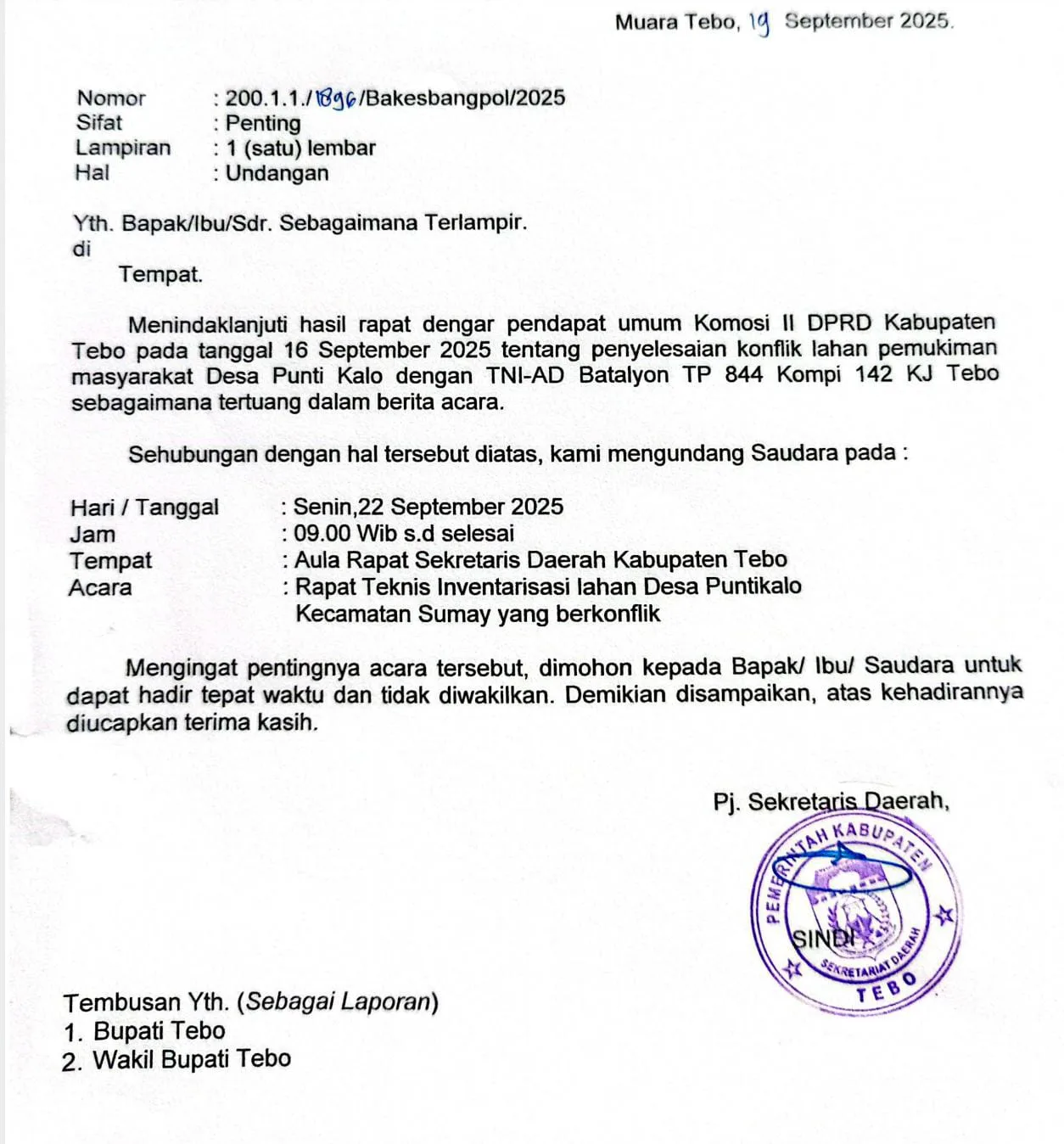 Surat resmi Pemerintah Kabupaten Tebo yang ditandatangani Pj. Sekretaris Daerah, Dr. Sindi, S.H., M.H., berisi undangan rapat teknis inventarisasi lahan Desa Punti Kalo, Kecamatan Sumay, terkait konflik dengan TNI-AD. (INJ/Ist)