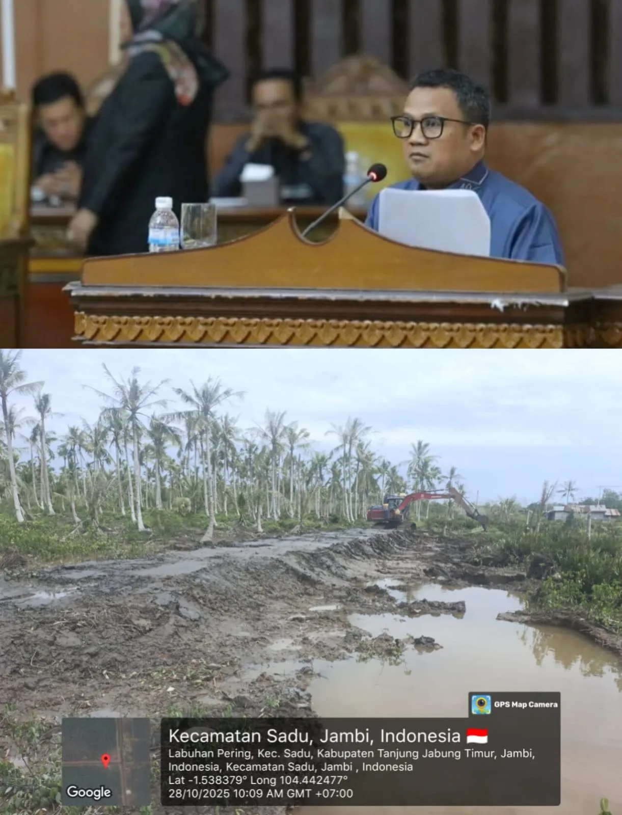 Di tengah upaya tersebut, Anggota DPRD Tanjab Timur Fraksi Golkar, Alam Bakri, menyoroti lambannya progres pekerjaan di wilayah tersebut, khususnya di ruas Desa Sungai Cemara–Labuan Pering. Dalam video yang diunggah di akun Facebook pribadinya, Alam Bakri menyampaikan kritik keras kepada pihak UPTD Alkal Unit Satker Sadu dalam Sidang Paripurna DPRD, Rabu (29/10/2025).