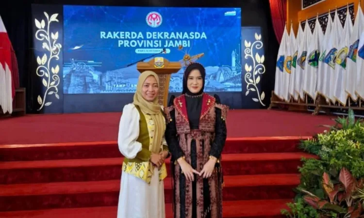 TEBO – Ketua Dekranasda Kabupaten Tebo, Ny. Nur Chasanah S.P., M.M., tampil penuh semangat menghadiri Rapat Kerja Daerah (Rakerda) Dekranasda Provinsi Jambi Tahun 2025 yang digelar di Auditorium Rumah Dinas Gubernur Jambi, Rabu (15/10/2025). Kegiatan bergengsi ini dihadiri seluruh Ketua Dekranasda se-Provinsi Jambi dan menjadi ajang penting dalam memperkuat sinergi pengembangan kerajinan daerah.