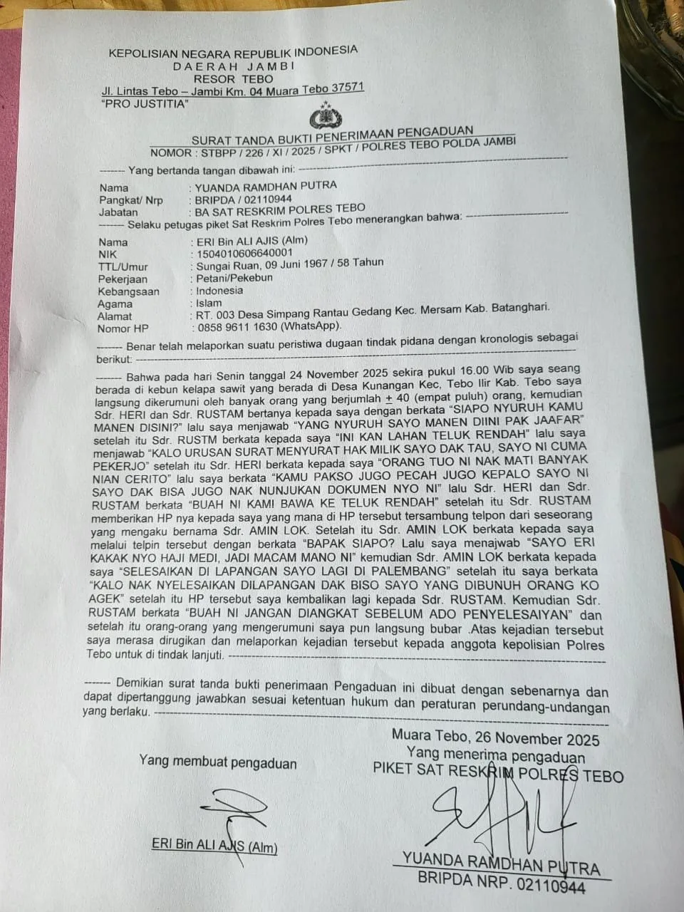 TEBO – Eri, seorang buruh panen sawit di Desa Kunangan, Kecamatan Tebo Ilir, Kabupaten Tebo, menjadi korban intimidasi dan perampasan Tandan Buah Segar (TBS) oleh sekelompok massa pada Senin sore, 24 November 2025. Massa tersebut mengaku berasal dari Desa Teluk Rendah Pasar dan bertindak atas perintah seorang mantan anggota DPRD Provinsi Jambi.