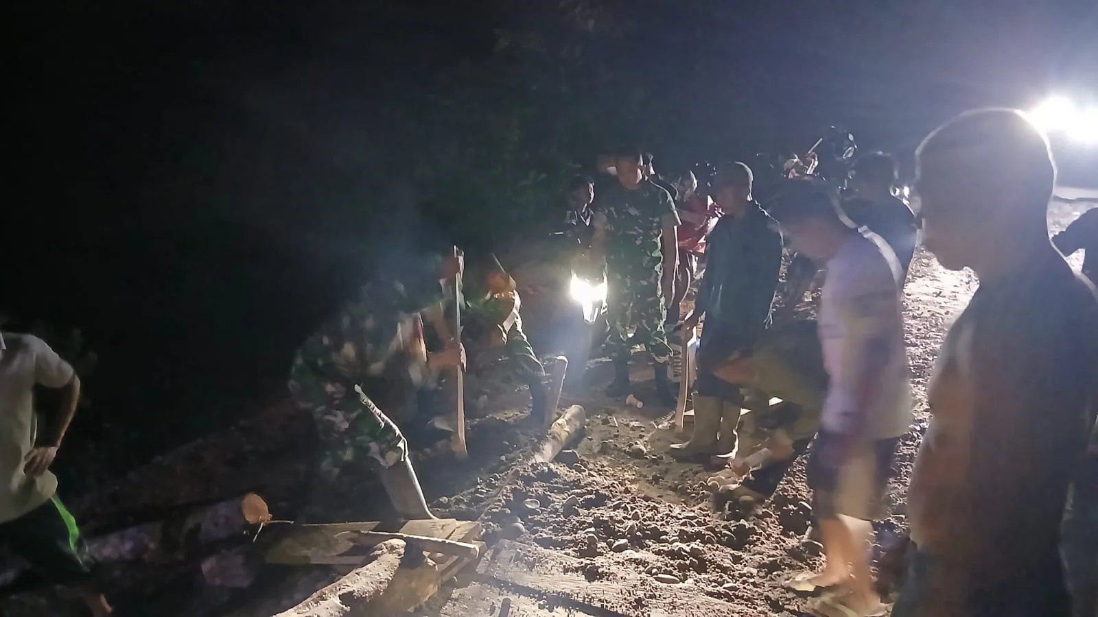 Pengerjaan jembatan darurat dilakukan secara gotong royong hingga malam hari, melibatkan berbagai pihak dengan semangat kebersamaan.