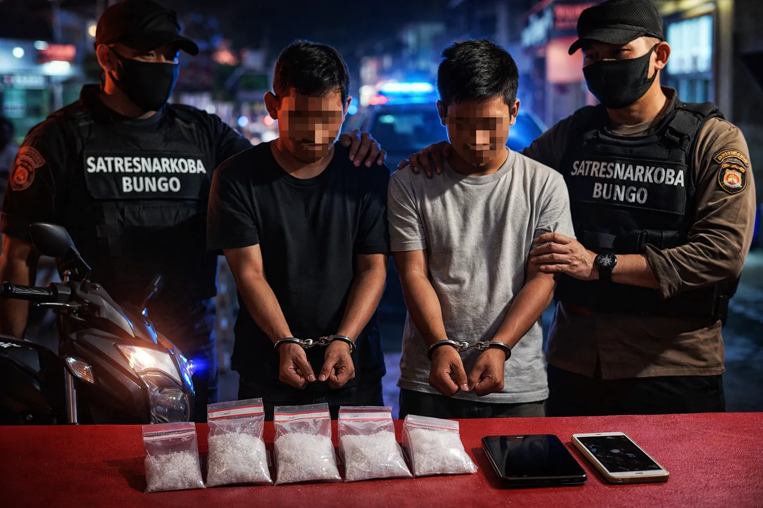 Saat ini, kedua pelaku beserta seluruh barang bukti telah dibawa ke Mapolres Bungo guna menjalani proses penyidikan lebih lanjut sekaligus pengembangan jaringan peredaran narkotika.
